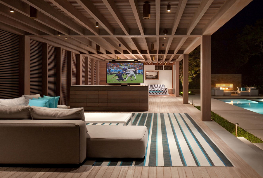 The heart of outdoor entertainment lies in the ambiance. Integrated lighting makes it easy to set the mood for any occasion, thanks to smart lighting control solutions from brands like Lutron and Control4.